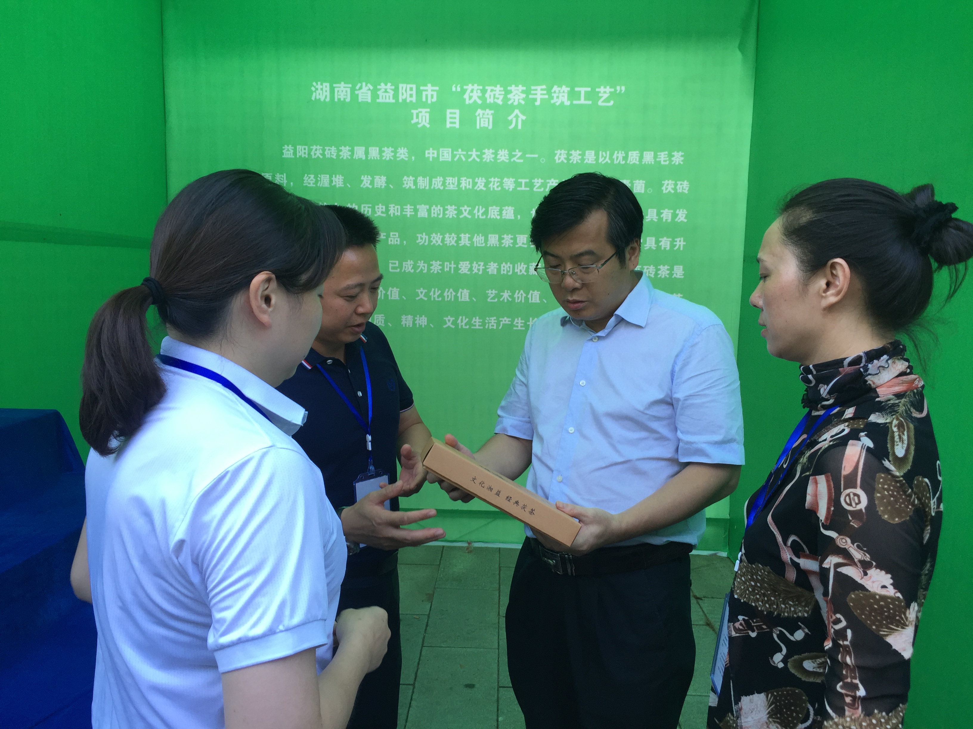 圖為湖南省文化和旅游廳副廳長(cháng)、省文物局局長(cháng)陳遠平( 左二)蒞臨湘益茯茶展位指導工作,茯磚茶非遺技藝傳承人徐迪軍、黃燕陪同。